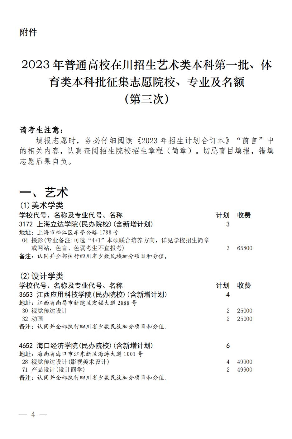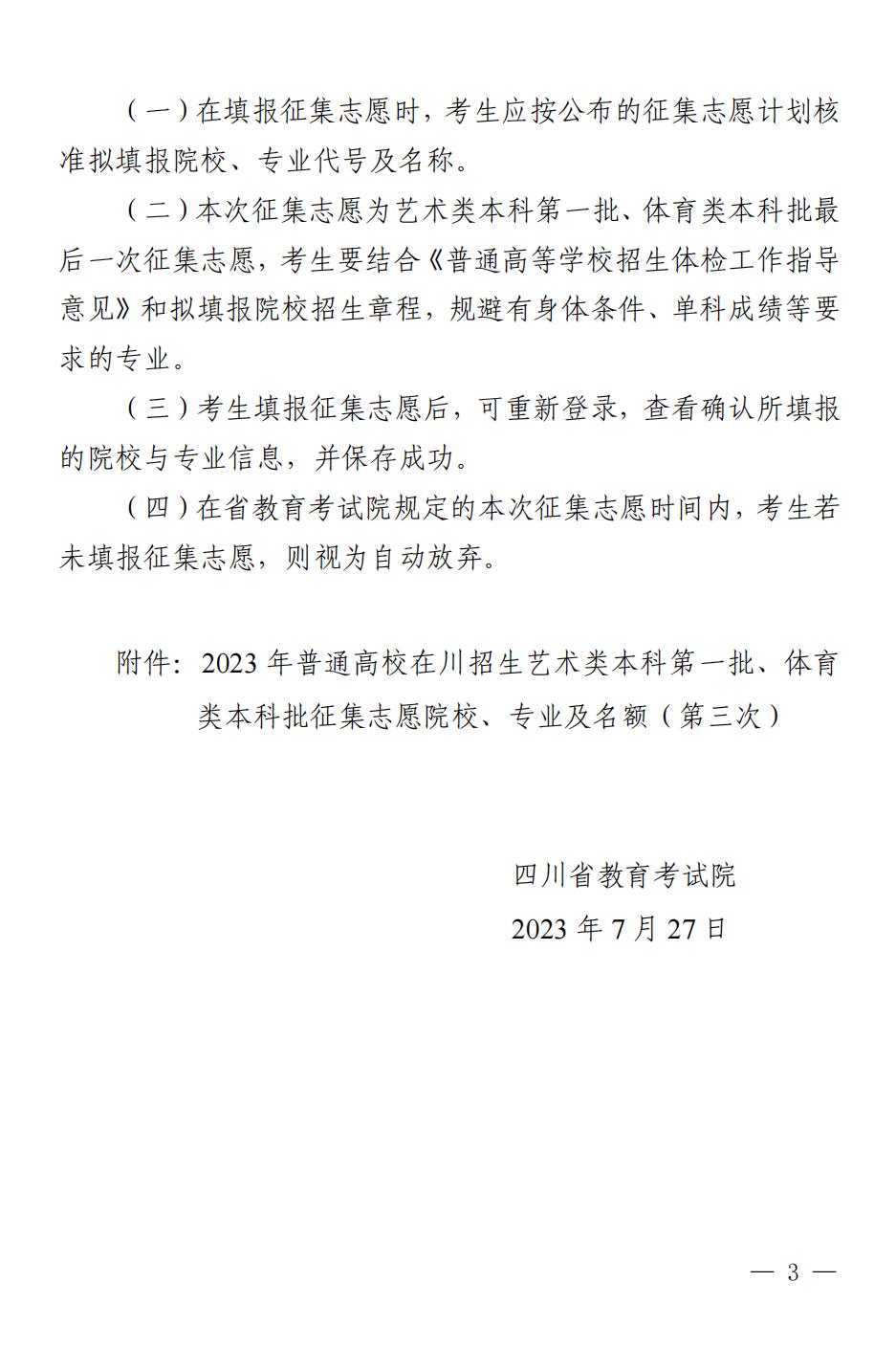 关于四川省2023年普通高校招生艺术类本科第一批、体育类本科批第三次 征集志愿的通知