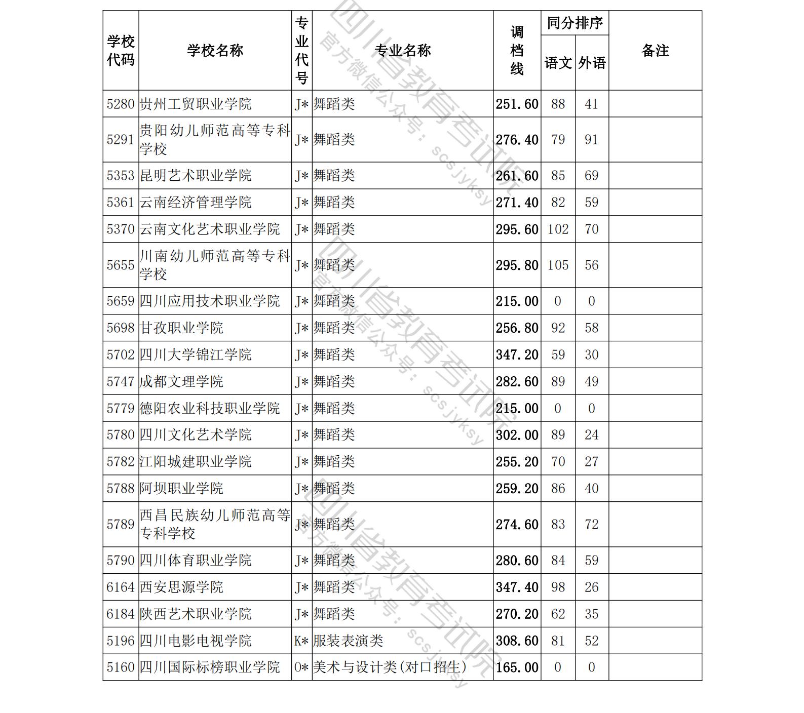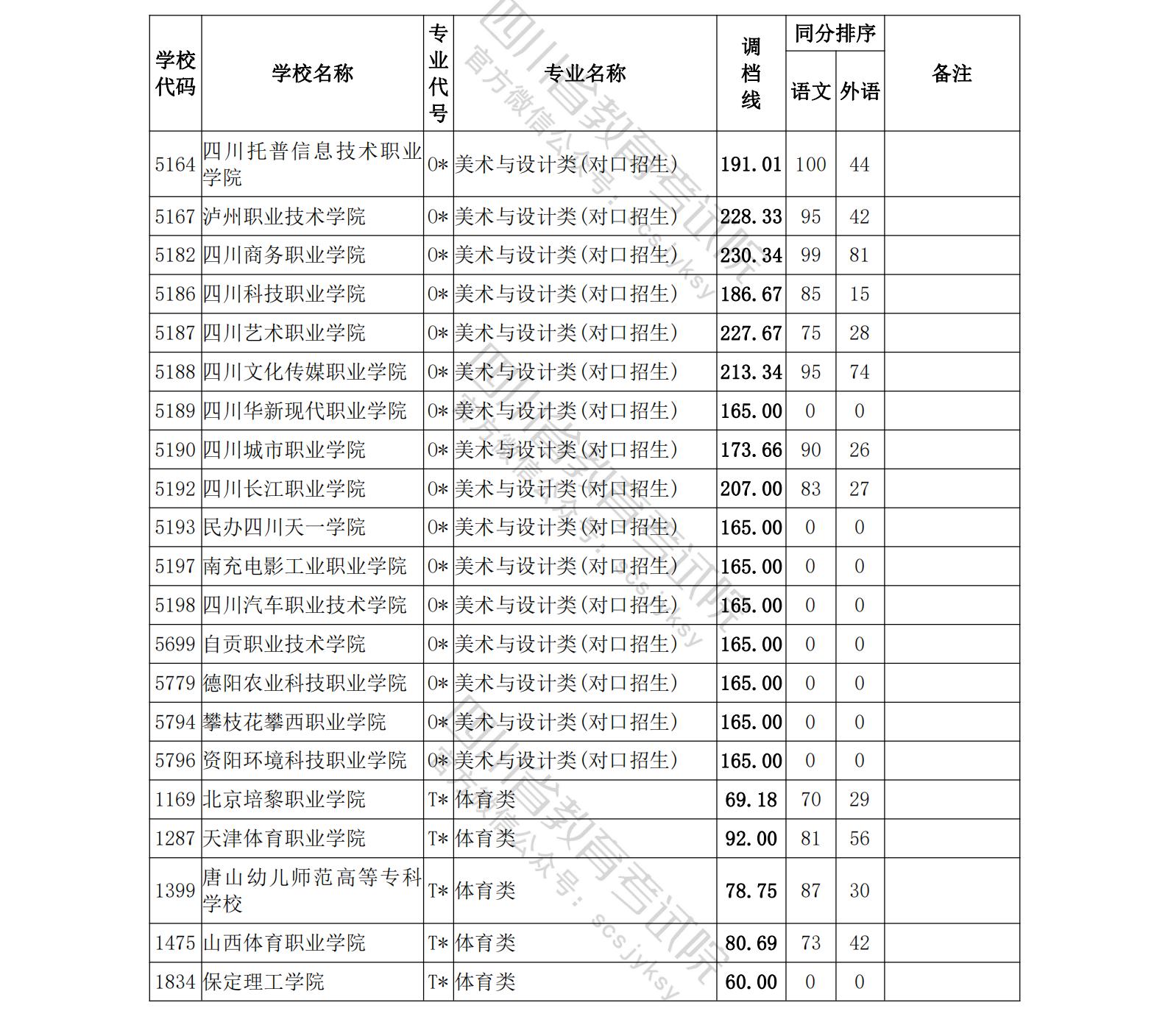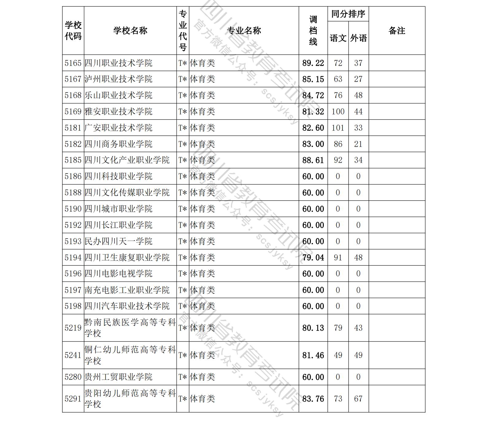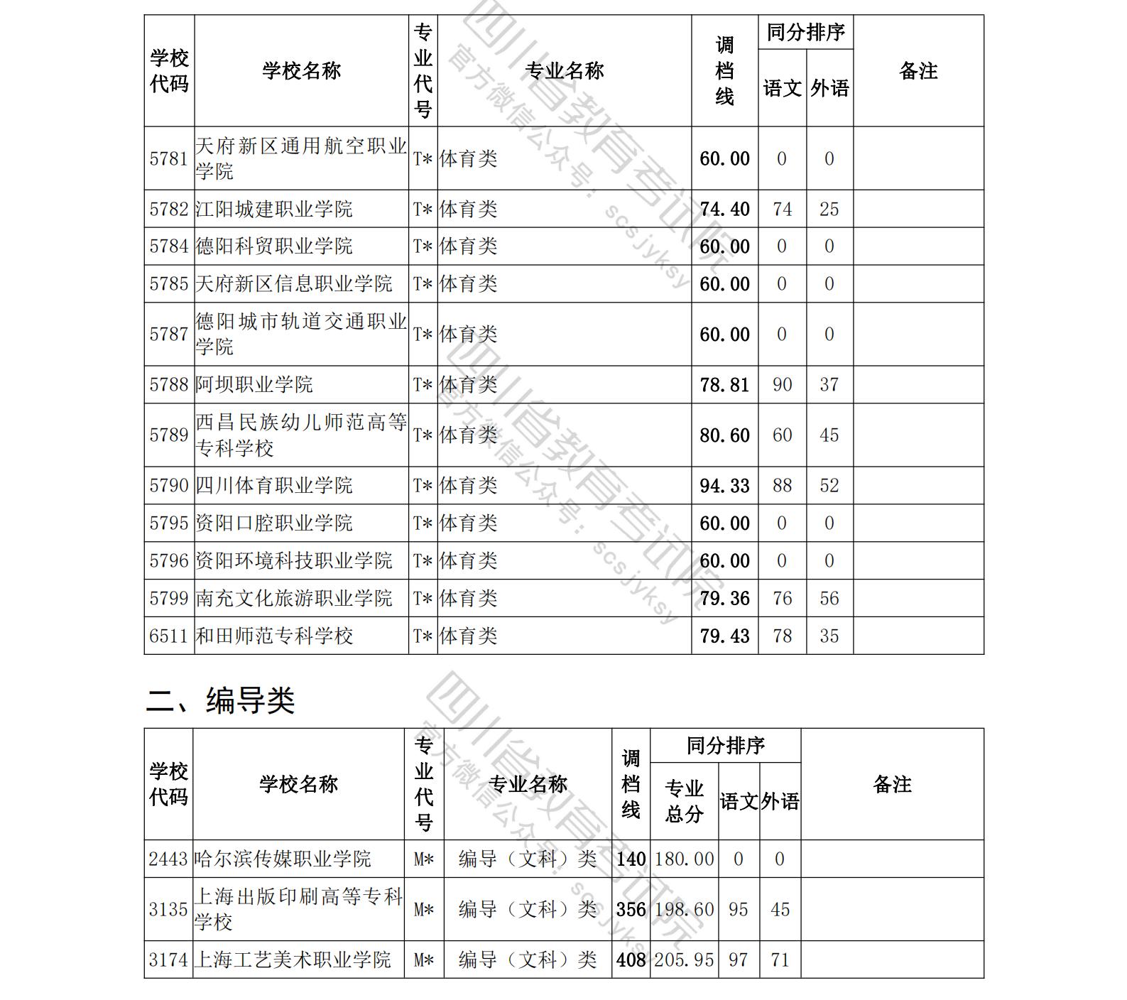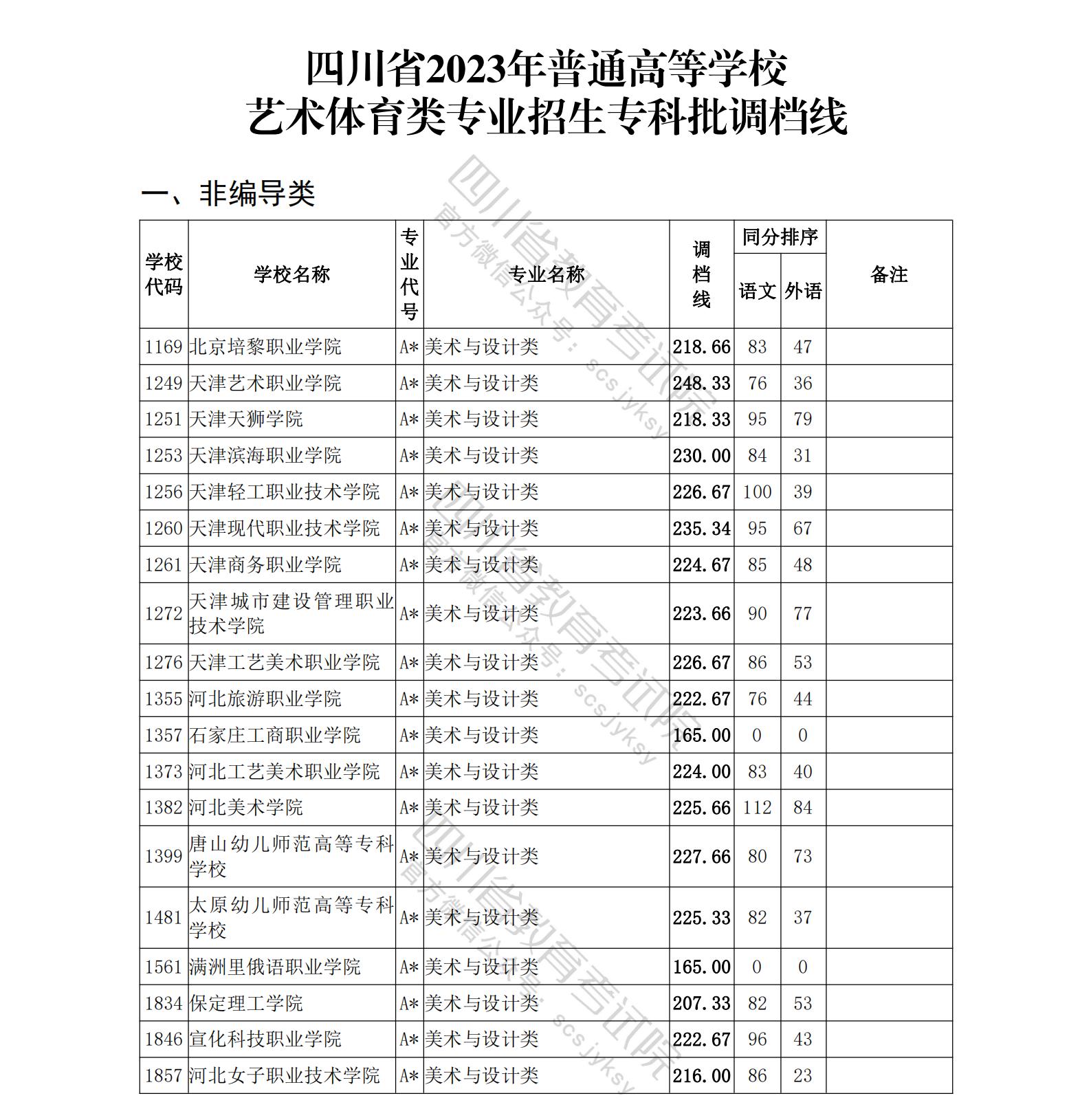 四川省2023年普通高等学校艺术体育类专业招生专科批调档线