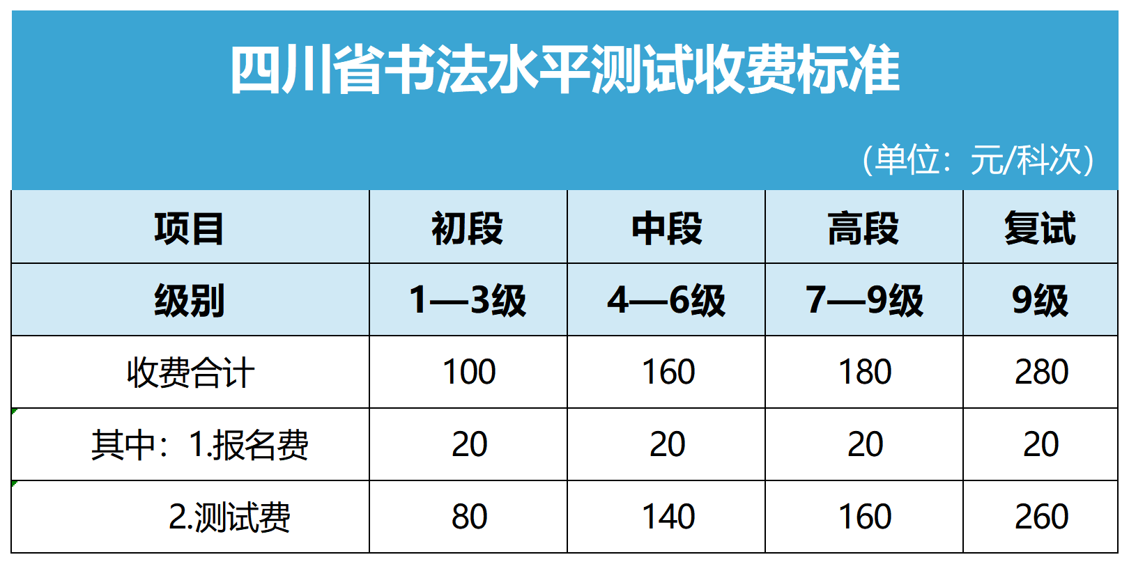 收费标准按照《四川省发展和改革委员会关于四川省书法水平测试有关收费问题的函》(川发改价格函〔2016〕36号)和《快乐彩18新利关于印发〈四川省书法水平测试经费管理办法〉的通知》(川教考院〔2022〕104号)规定收取,具体标准如下表所示。