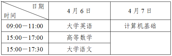 答:我省2024年普通高校专升本考试于4月6日、7日统一组织进行。高等数学、大学语文、大学英语、计算机基础均实行全省统一考试。各科目考试时间(北京时间)安排如下: