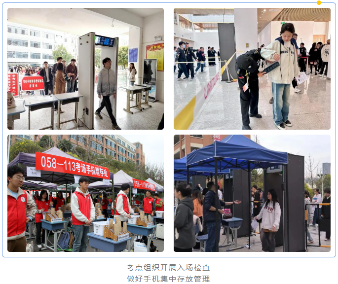 考试当天,各地组考单位强化责任担当,狠抓安全保密和考风考纪,构筑防范打击手机作弊“五位一体”防护网。所有考点全部配备智能安检门,因地制宜完善考生进入考点安检实施方案,做好考点手机集中统一存放管理,确保本次考试各项工作平稳有序。