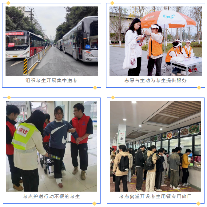 各组考学校用心用情服务考生,纷纷推出暖心举措:考点绘制考场示意图、温馨提示事项,方便指引考生进入考点考场;设立休息区,为老师、家长提供服务;部分考点提前规划运送路线,为考生集中送考提供便利,确保考生如期安全送达;有的考点安排志愿者,为参考考生提供咨询、引导和帮助。全省各考点坚持以人为本,为46名符合条件的特殊类型考生提供合理便利,助力考生平安赶考、顺利赴考、温馨参考。