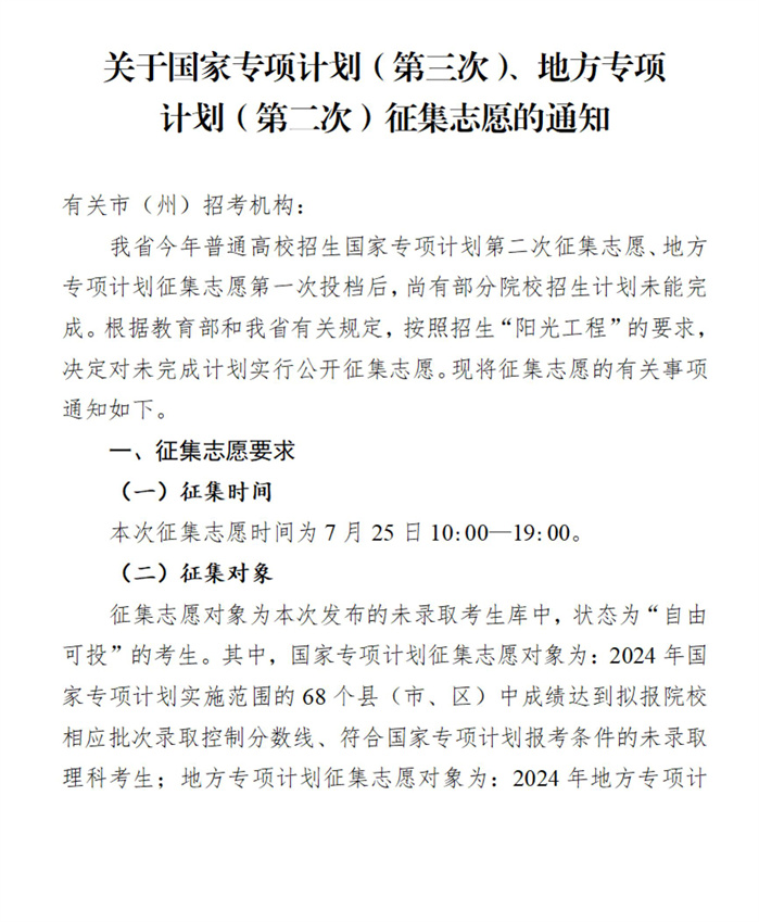 关于国家专项计划(第三次)、地方专项计划(第二次)征集志愿的通知