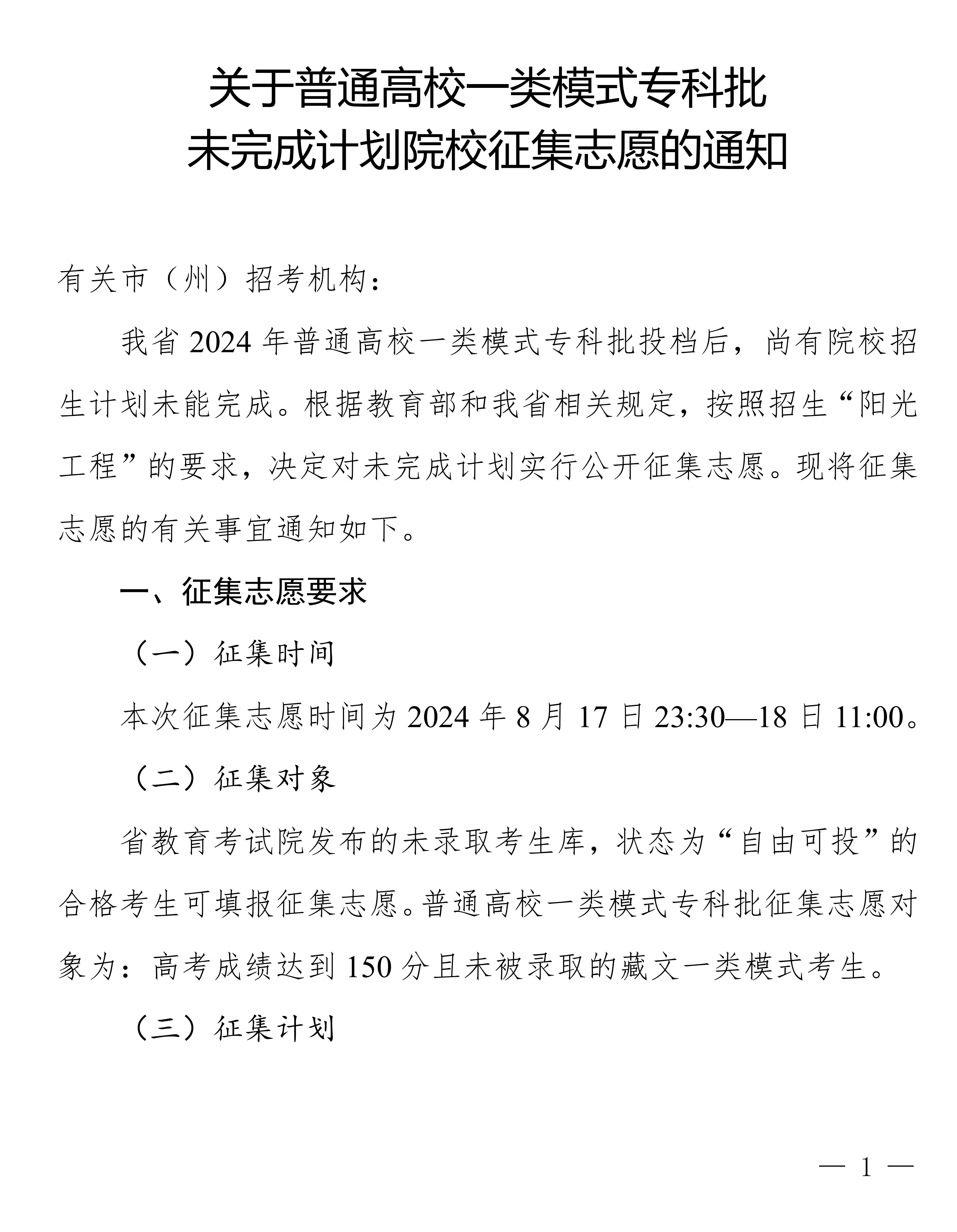 关于普通高校一类模式专科批未完成计划院校征集志愿的通知