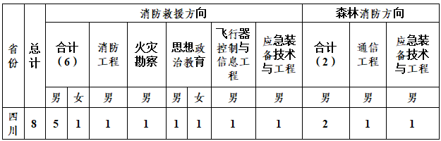 2025年中国消防救援学院计划在四川省招收8名青年学生(男生7名、女生1名;理科6人、文科2人)。其中,消防救援方向6人(含女生1人),森林消防方向2人,具体招生计划详见下表。