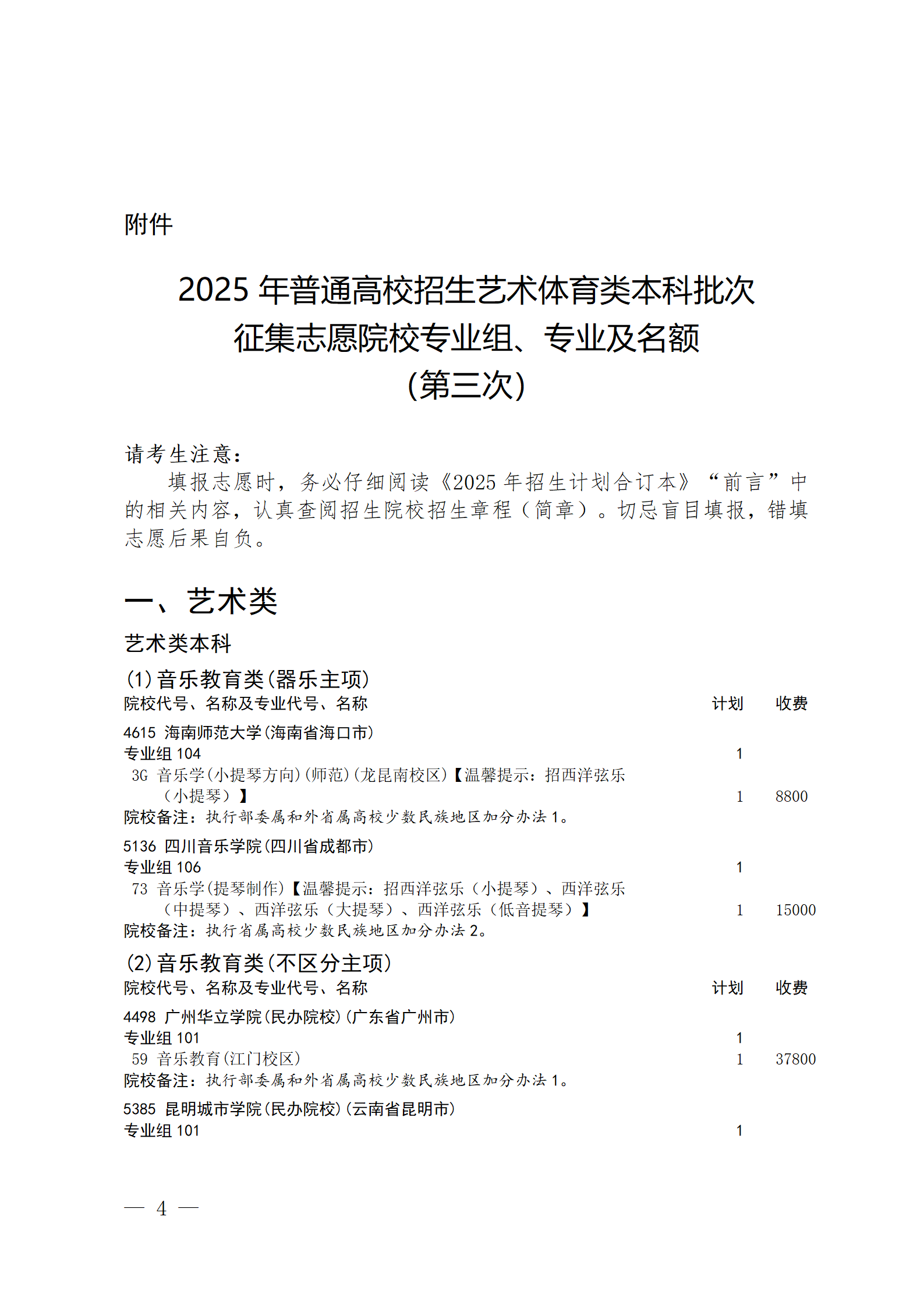 关于我省2025年艺术体育类本科批次未完成计划院校第三次征集志愿的通知
